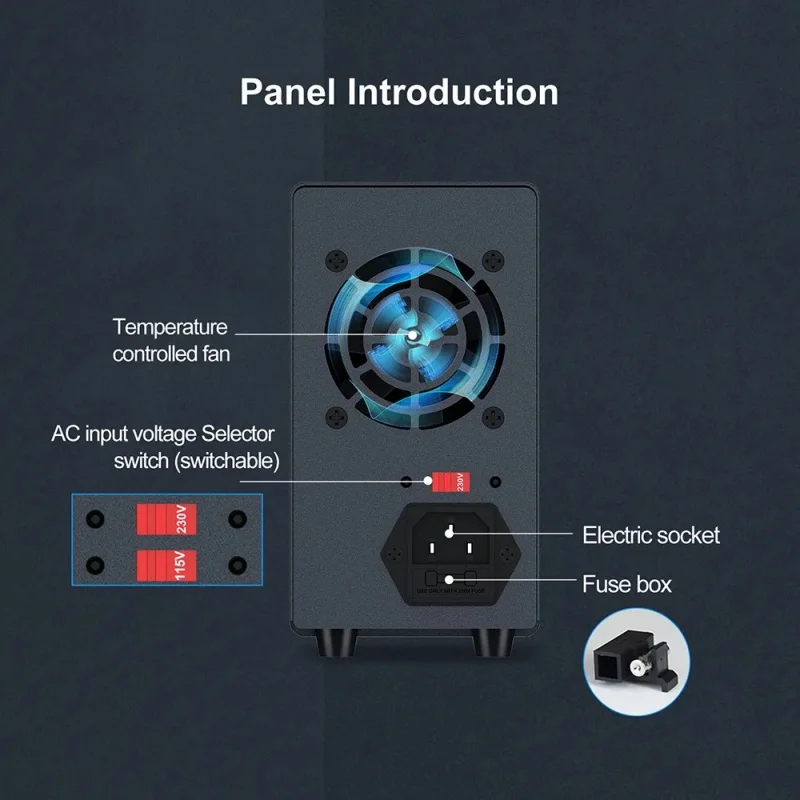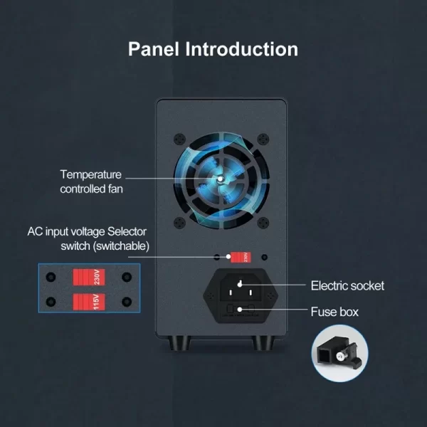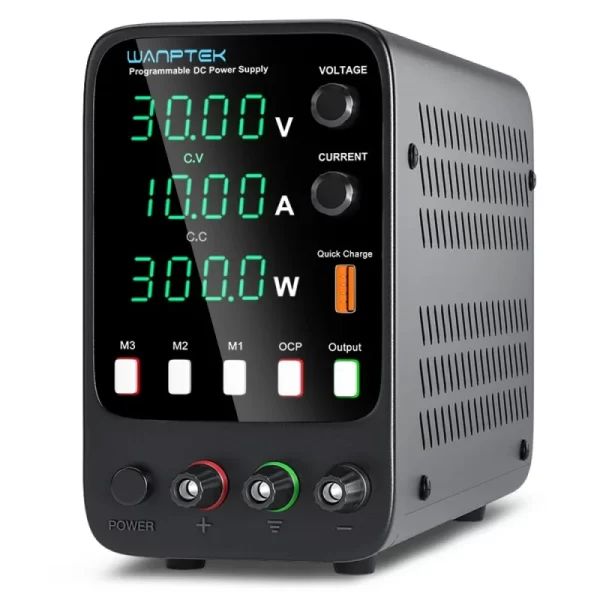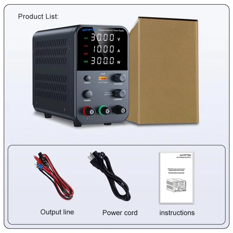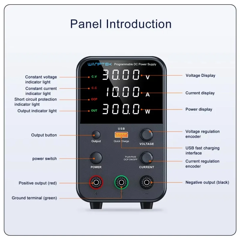 This model is a miniature switching DC power supply. The output voltage and current can be controlled and adjusted Encoder adjustment, so it provides more convenience and accuracy in the adjustment of voltage and current. The panel also provides high-precision two/three-window digital tube display of voltage, current and power(optional), so that users can intuitively see the current use status and various parameters of the machine