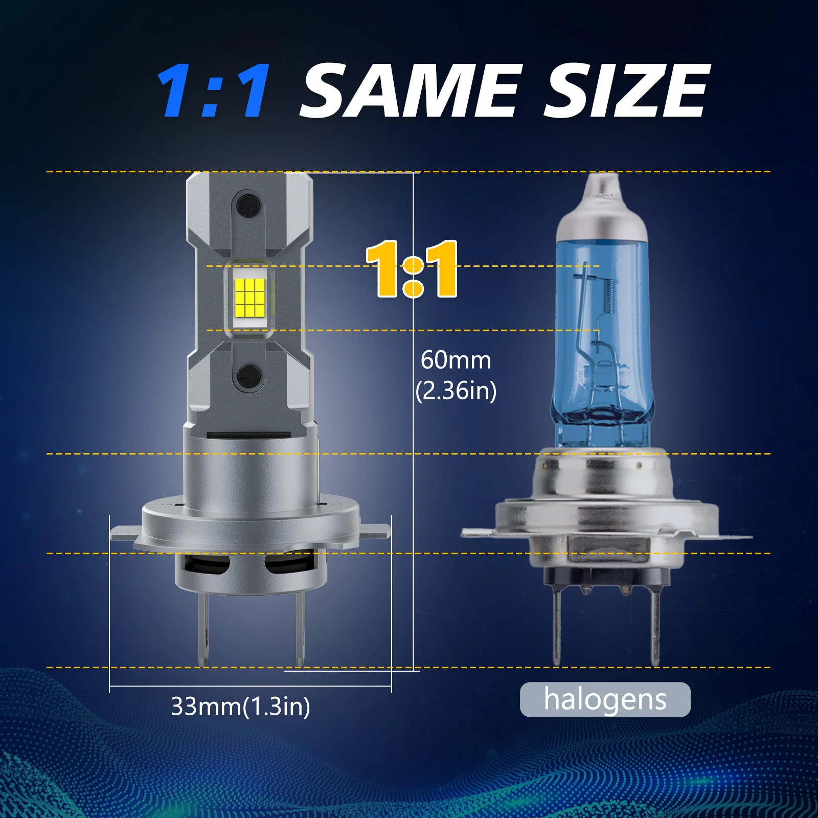 1:1 mini size as original halogen bulbs for higher compatibility and simple installation.