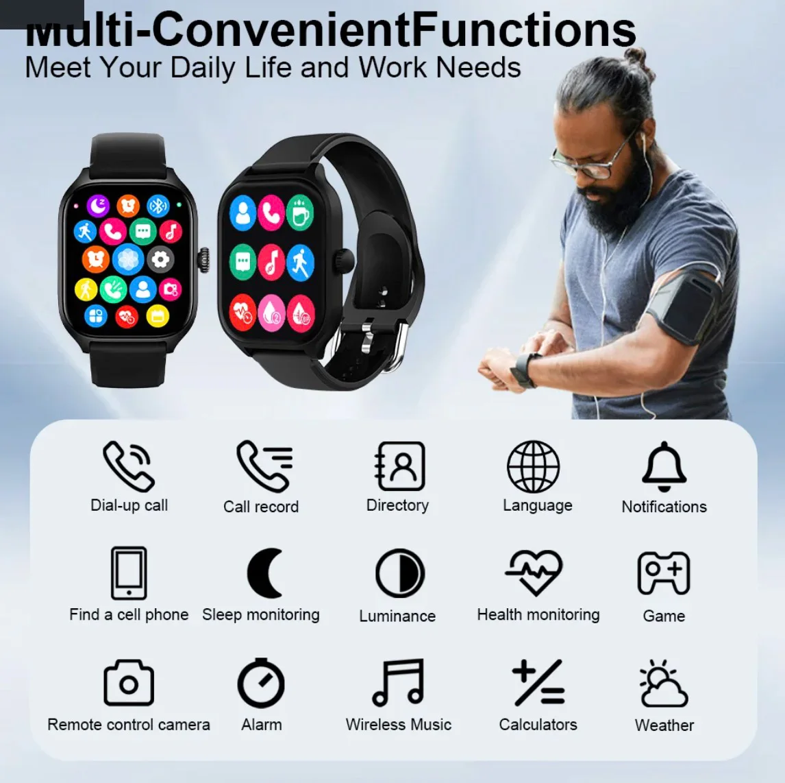 The watch can make and receive calls, sync your phone book, listen to music, and monitor steps, calories, heart rate, distance, sleep quality, and more. This day. At the same time, it can connect to smart phones to view information, remote photos, retrieve mobile phones and other intimate and convenient functions, so that your life is more convenient. 19 exercise modes Know your exercise intensity and physical condition in time so that you can adjust your fitness plan in time.