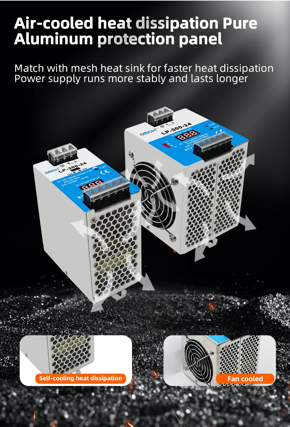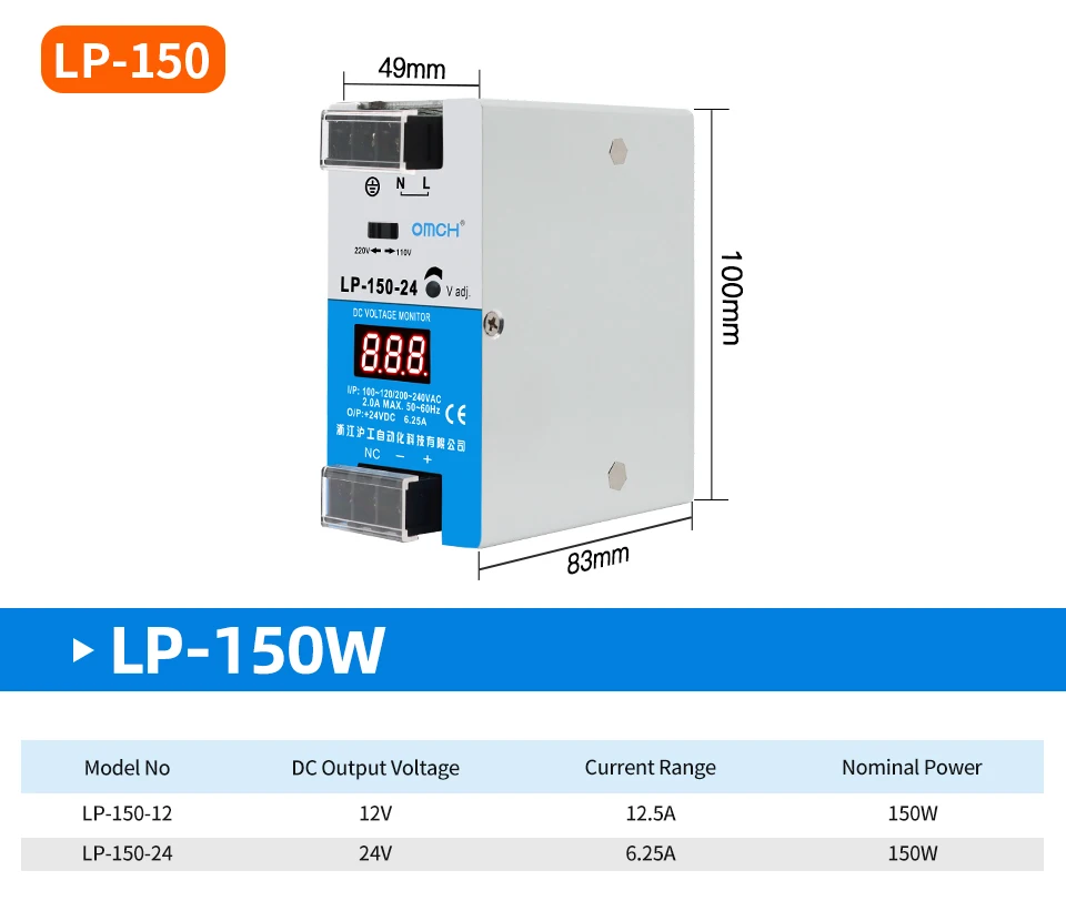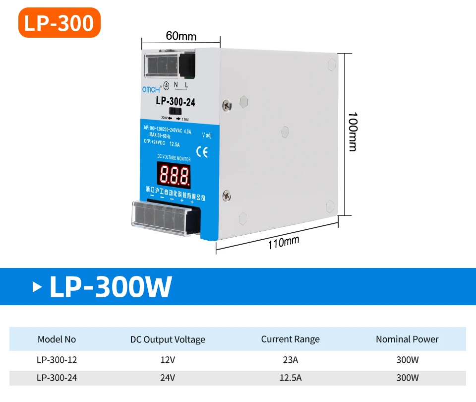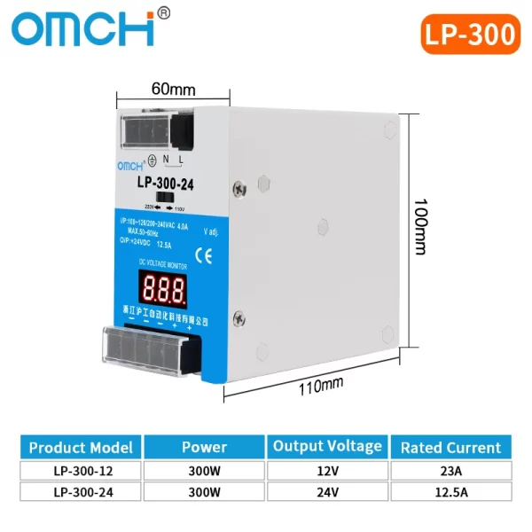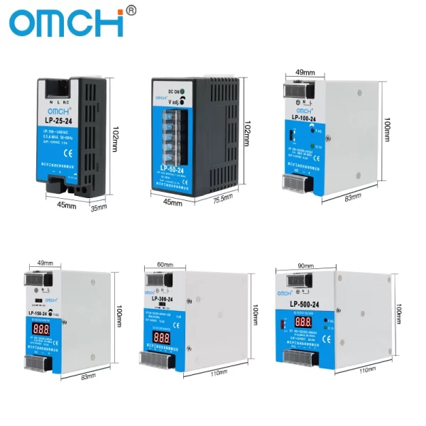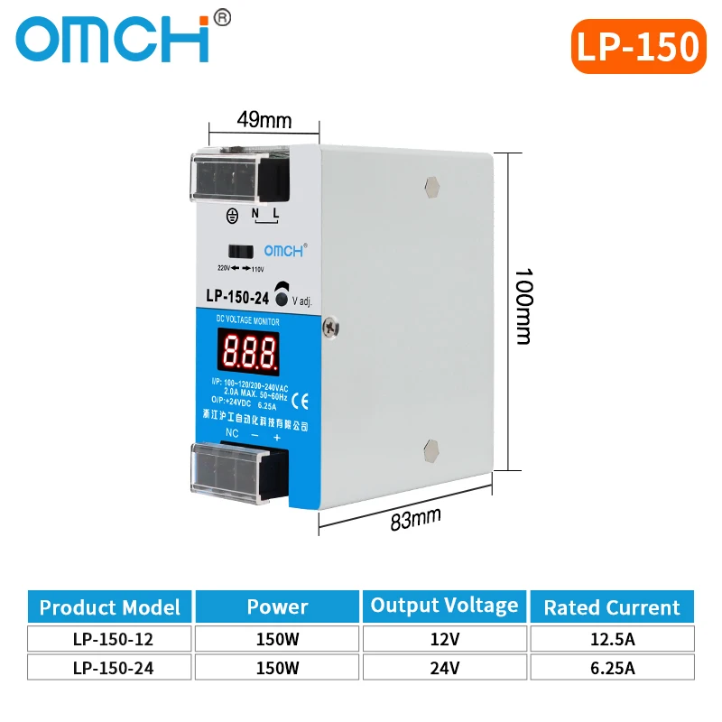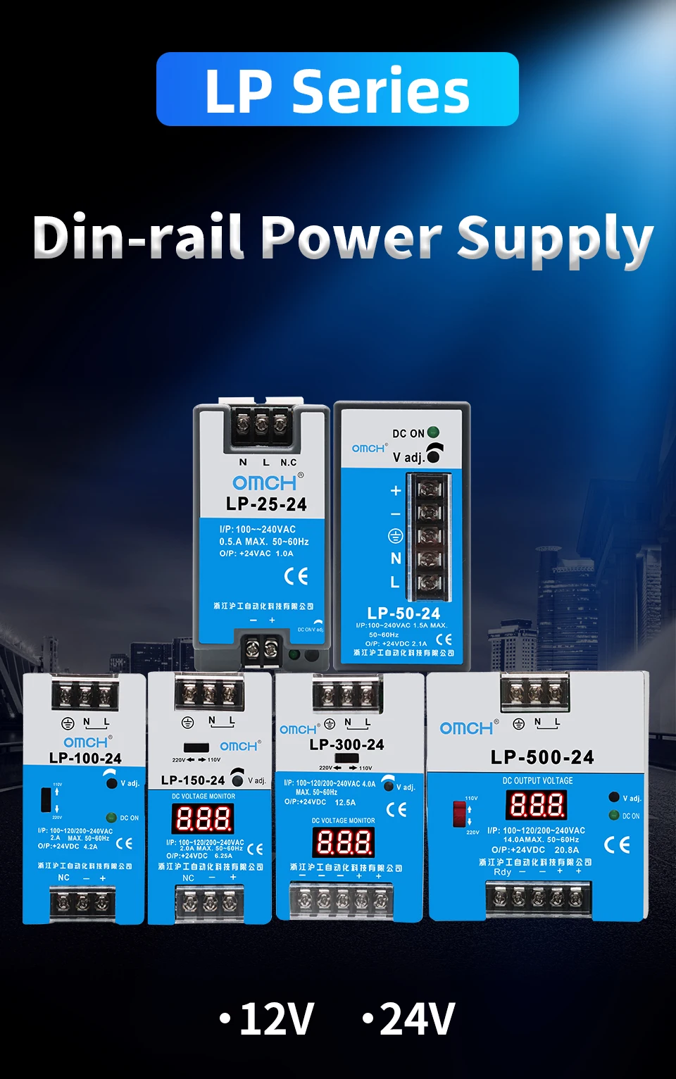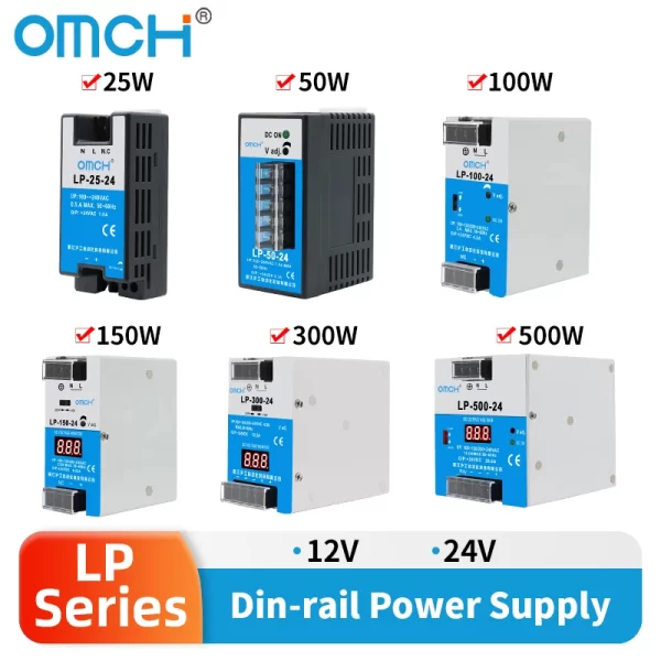 OMCH Din-rail Digital Display LP-25W/50W/100W/150W/300W/500W Output 12V 24V Input 100-240VAC Output Switching power supply SMPS