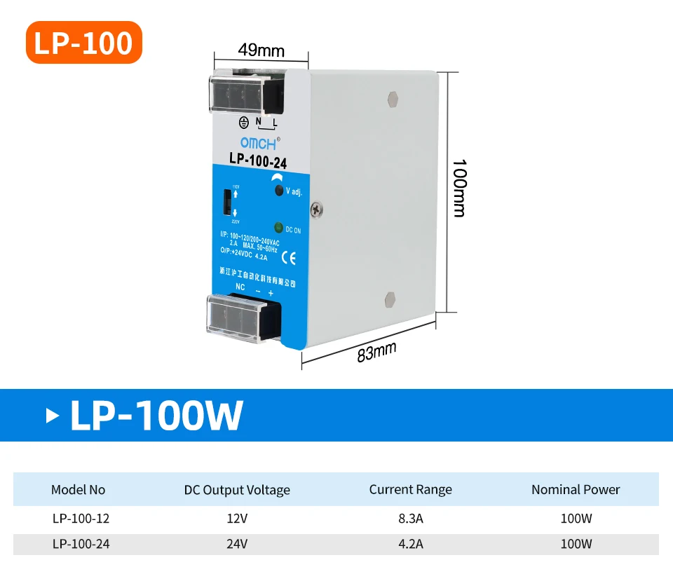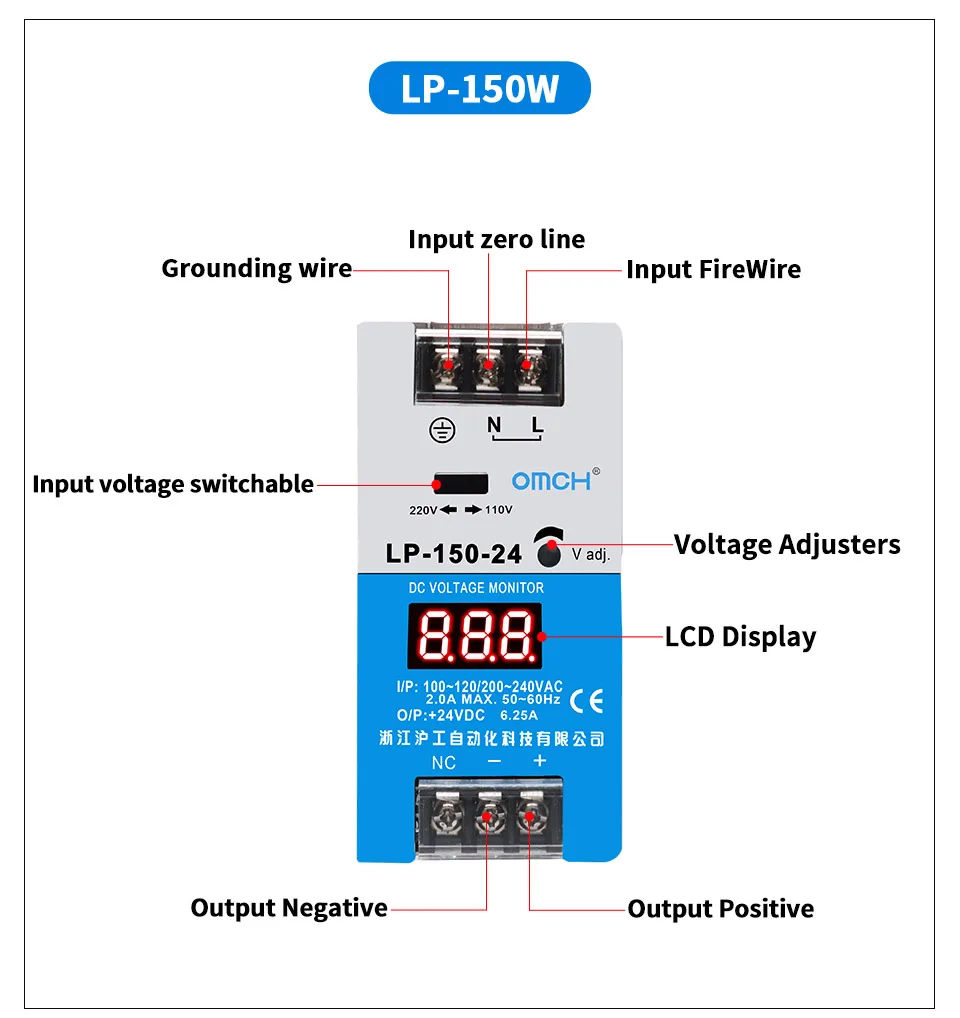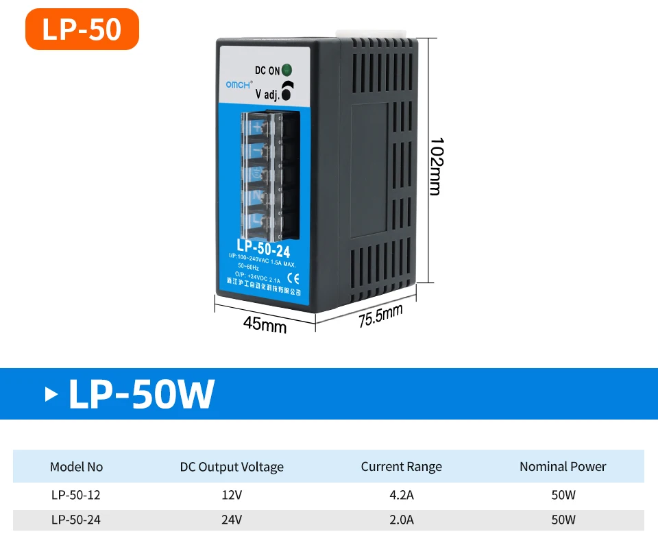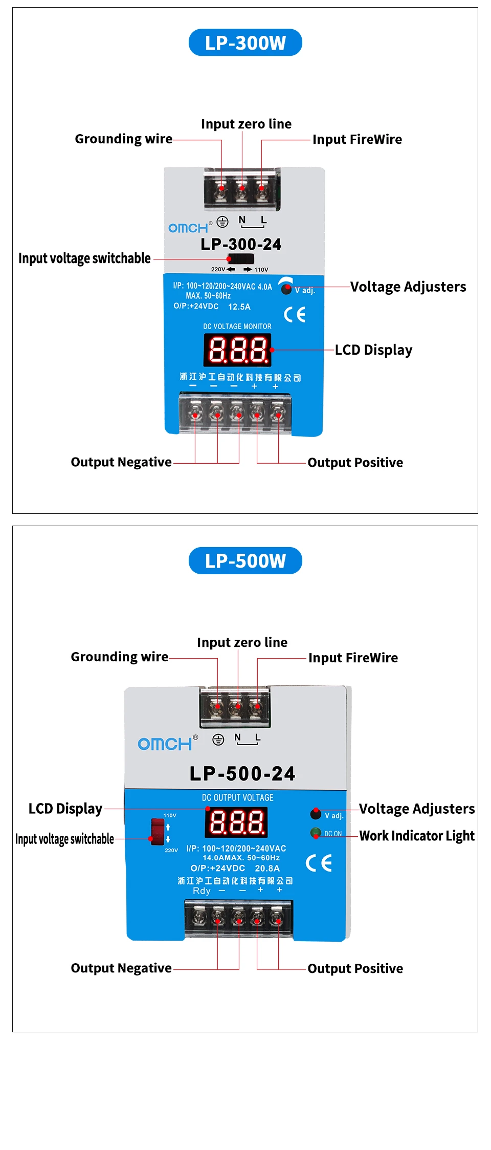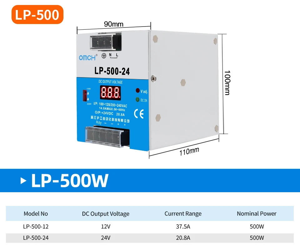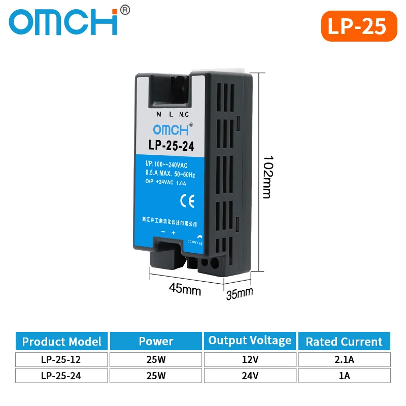 OMCH Din-rail Digital Display LP-25W/50W/100W/150W/300W/500W Output 12V 24V Input 100-240VAC Output Switching power supply SMPS