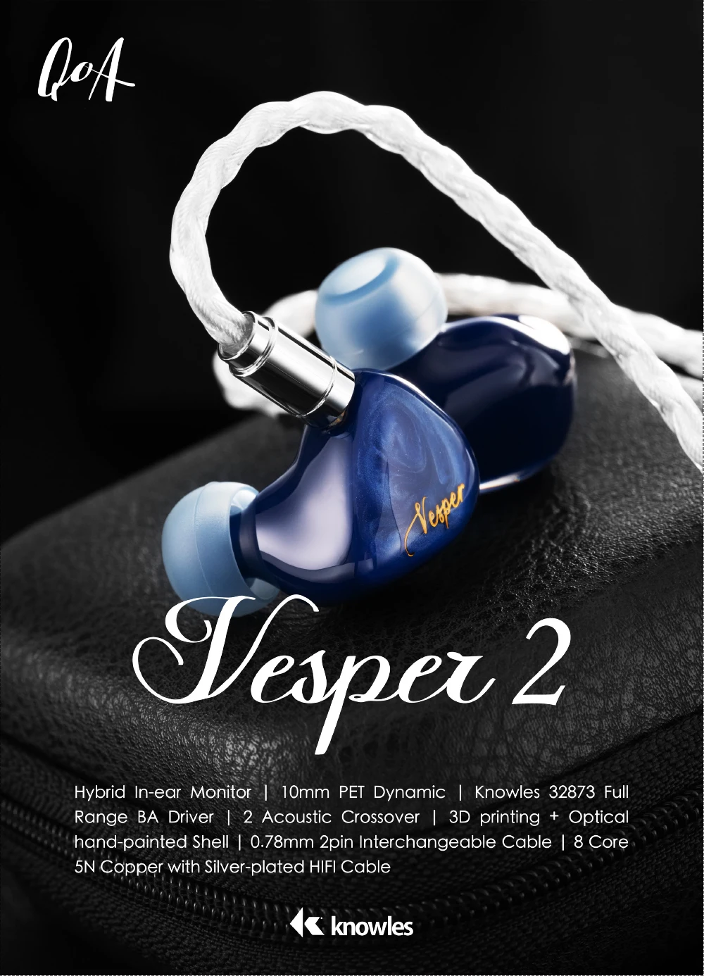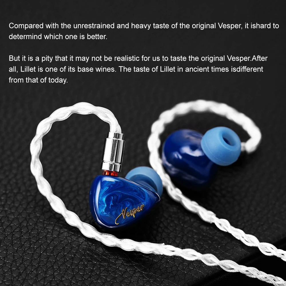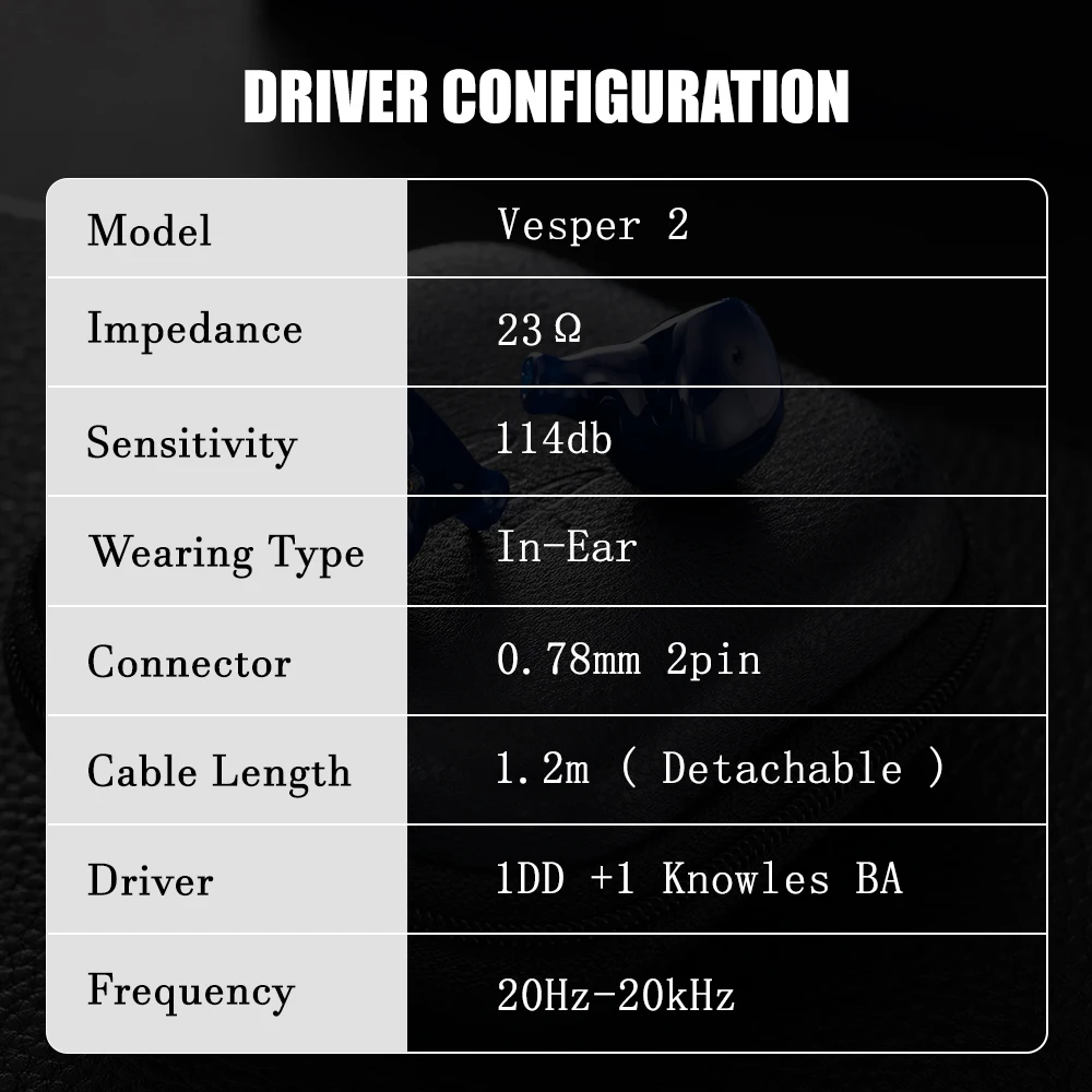 【10mm PET diaphragm dynamic unit+Imported Knowles 32873 BA driver】- 2 adopts the tuning scheme of hybrid drivers with 2-way, 2 acoustic tubes. Bass and mid-range are handled by the dynamic unit. Custom-made Knowles full-frequency balanced armature driver is integrated with it to achieve the sound: Better integration of warm and cold timbre, energy distribution and its full-range imaging. Through repeated adjustments, finally achieve the thick and distinct vocal experience of the original Vesper.