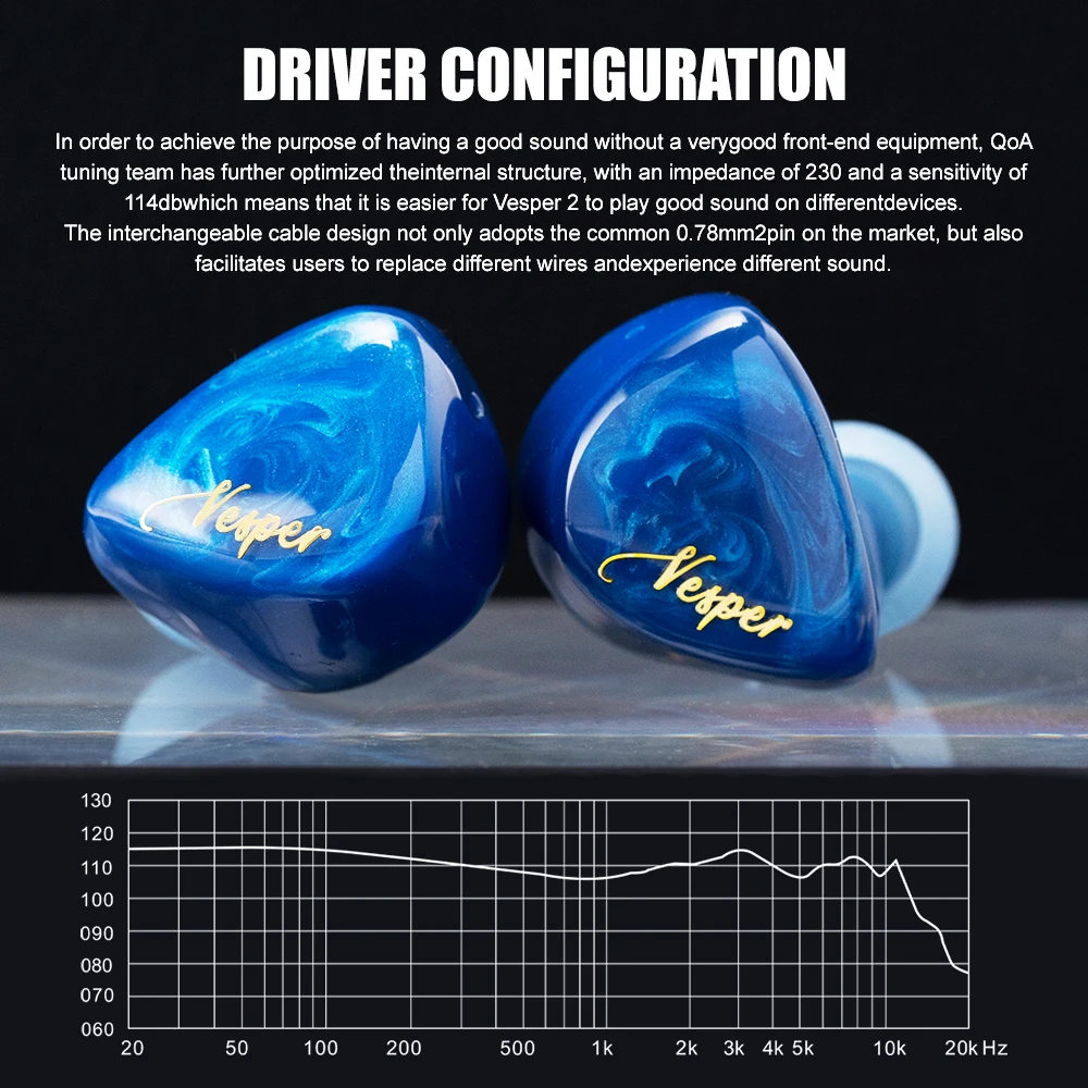 【Internal structure optimization】-In order to achieve the purpose of having a good sound without a very good front-end equipment, QoA tuning team has further optimized the internal structure, with an impedance of 23Ω and a sensitivity of 114db, which means that it is easier for Vesper 2 to play good sound on different devices