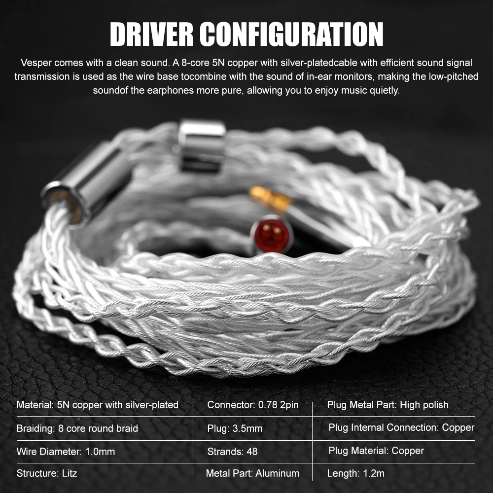 【8 Core 5N Copper with Silver-plated HIFI Cable】-The interchangeable cable design not only adopts the common 0.78mm 2pin on the market, but also facilitates users to replace different wires and experience different sound. Vesper comes with a clean sound. A 8-core 5N silver-plated copper cable with efficient sound signal transmission is used as the wire base to combine with the sound of in-ear monitors, making the low-pitched sound of the earphones more pure, allowing you to enjoy music quietly.