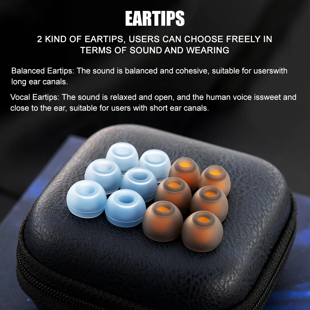 【2 kind of eartips, users can choose freely in terms of sound and wearing】-Balanced Eartips: The sound is balanced and cohesive, suitable for users with long ear canals. Vocal Eartips: The sound is relaxed and open, and the human voice is sweet and close to the ear, suitable for users with short ear canals.