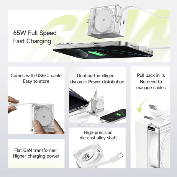 Retractable cable. Foldable plugs. 65W max output. Transparent design.