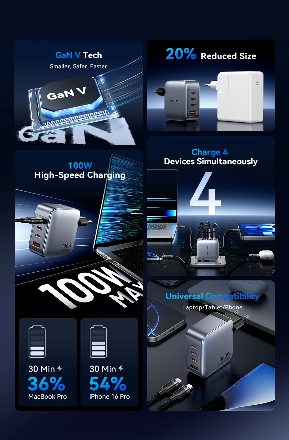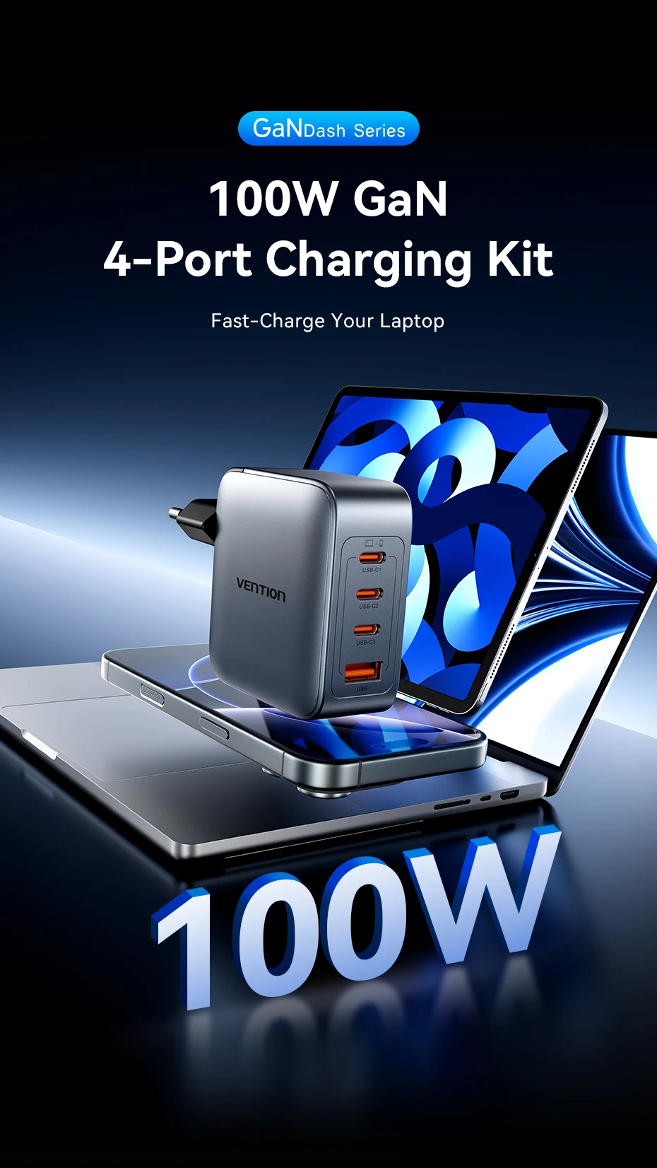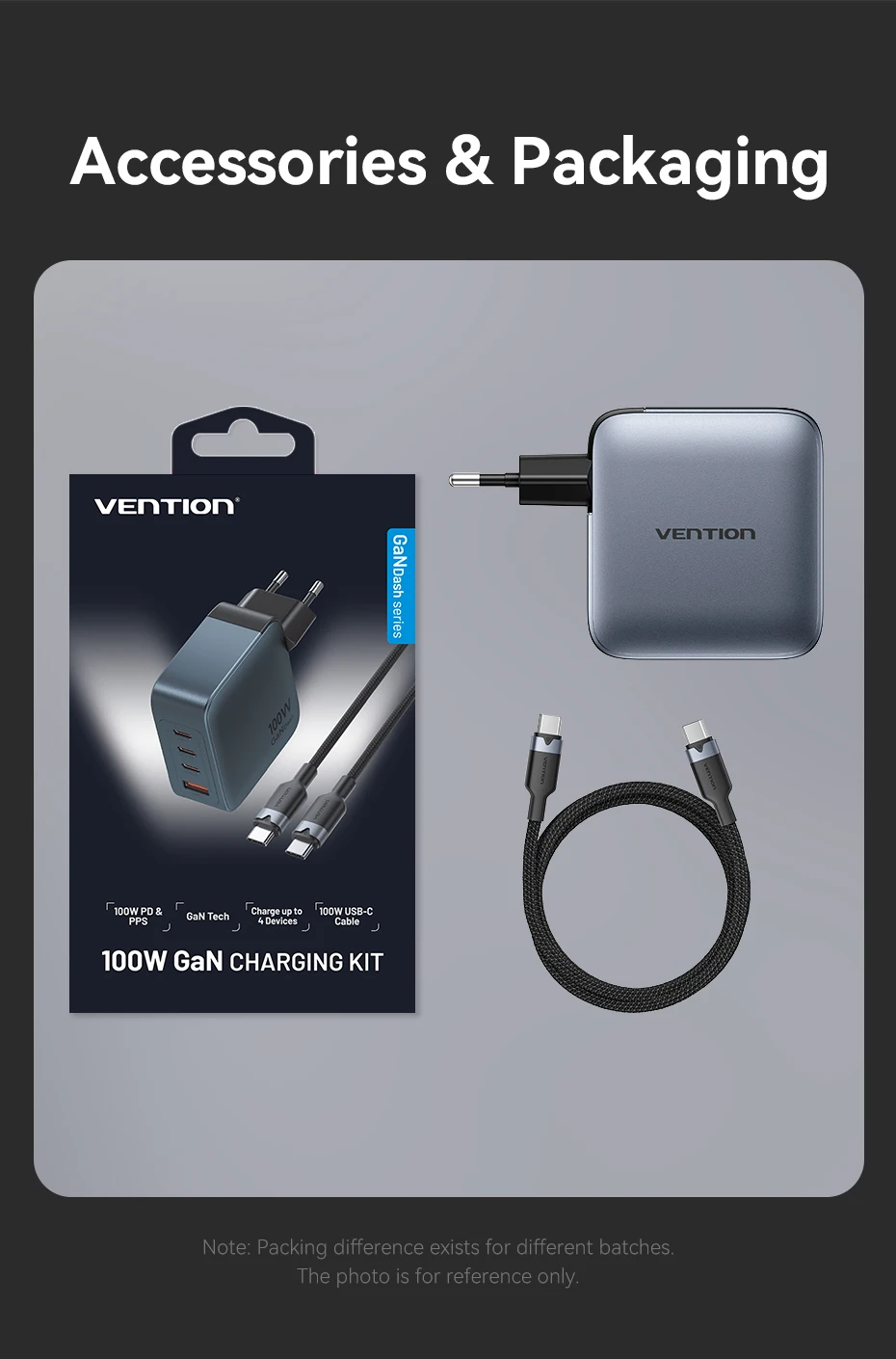 Vention 100W USB GaN Charger USB Type C Quick Charge 4.0 3.0 Fast Charging for iPhone 16 15 14 13 12 Xiaomi Huawei USB C Charge