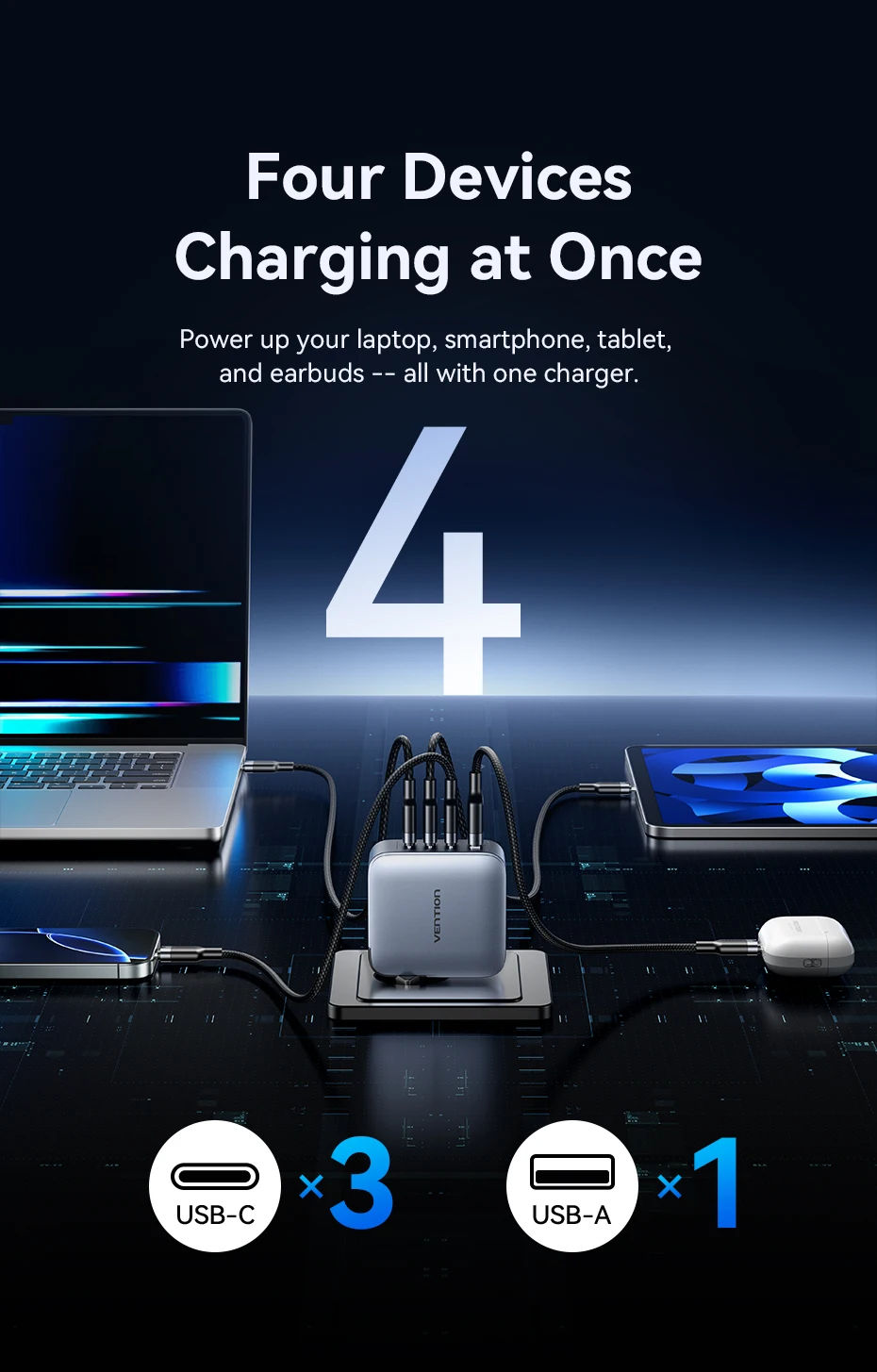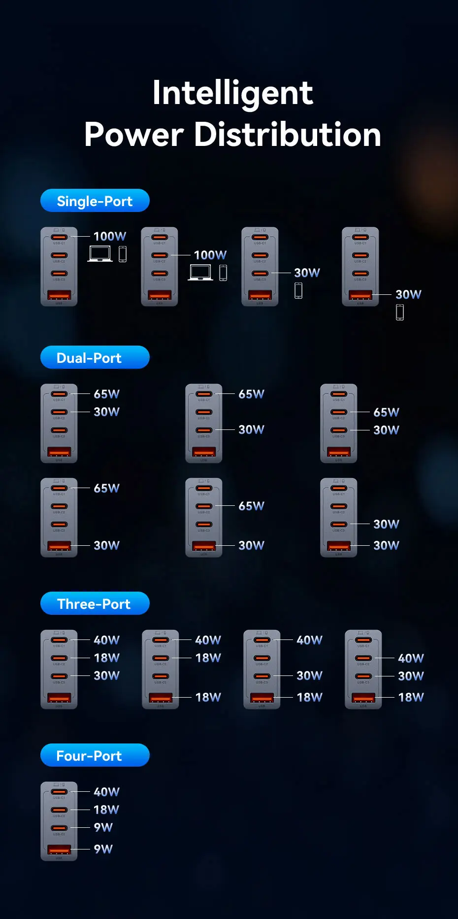 USB-C1 + USB-C2 + USB-C3 + USB-A: 40W + 18W + 9W + 9W