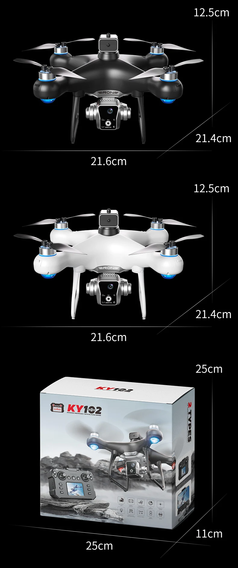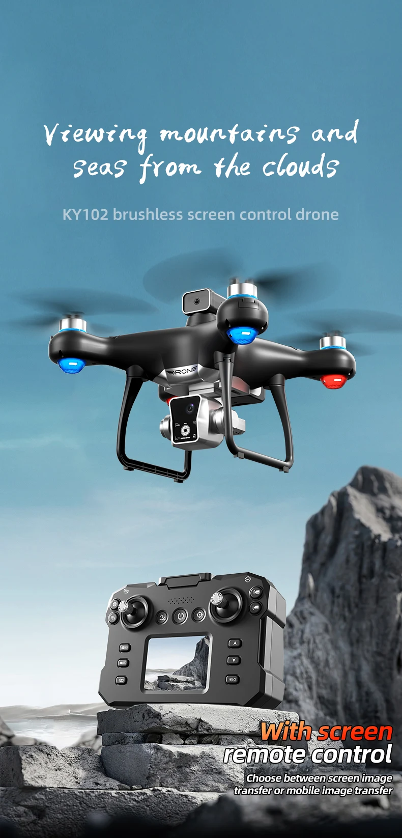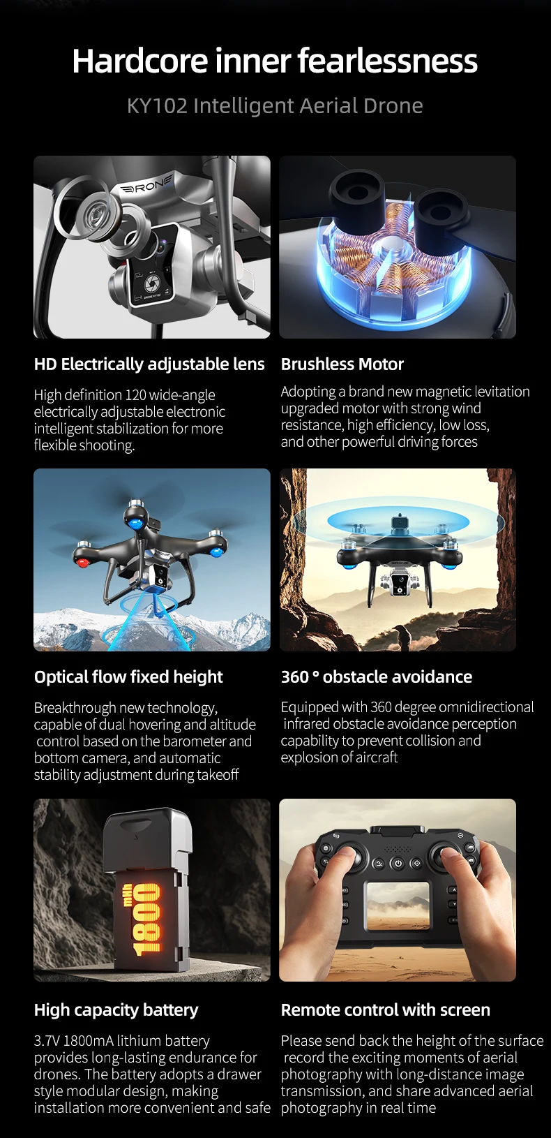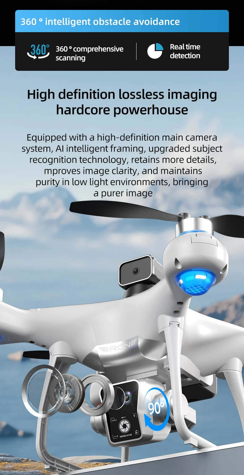 1. Place the wide-angle 4K high-definition WIFI on the front lens, and the bottom high-definition lens with optical flow can switch the shooting angle. The servo gimbal is designed to increase stability and add EIS electronic image stabilization, making the photos clearer when taken